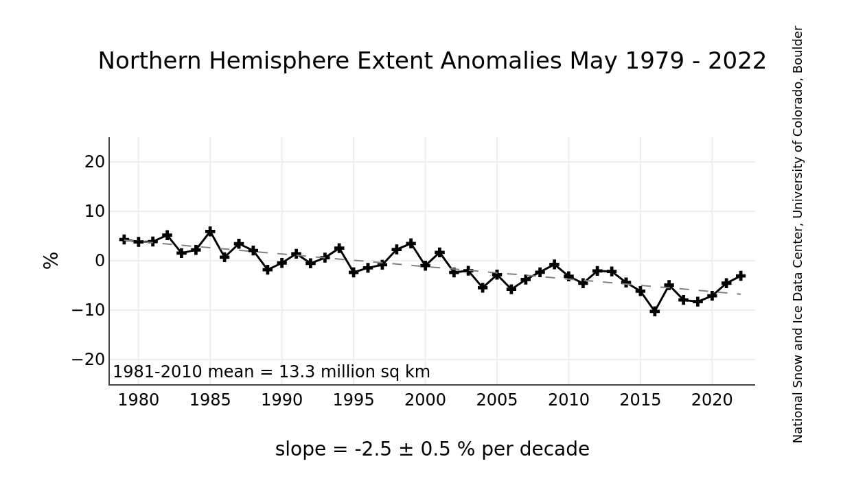 This graph shows monthly ice extent anomalies plotted as a time series of percent difference between the extent for the month in question and the mean for that month based on the January 1981 to December 2010 data. The anomaly data points are plotted as plus signs and the trend line is plotted with a dashed grey line.