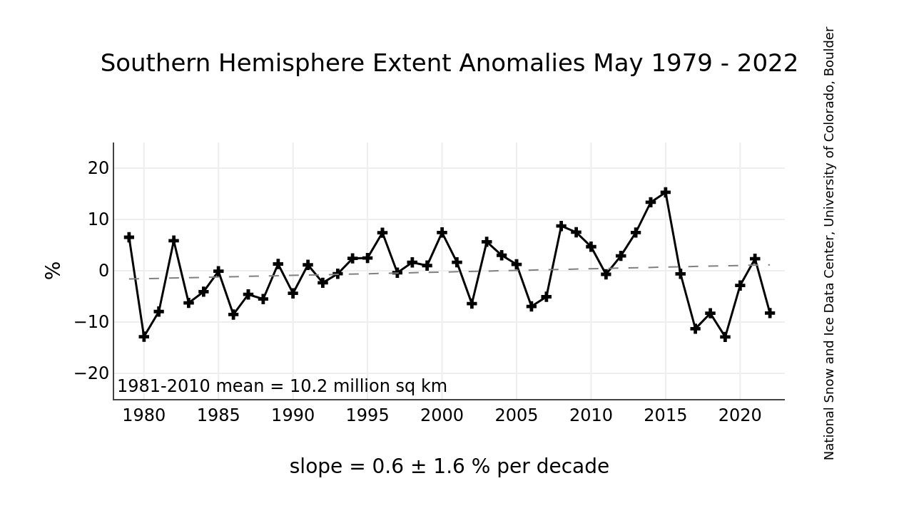 The monthly Sea Ice Index provides a quick look at Arctic-wide / Antarctic-wide changes in sea ice (ocean area where there is at least 15% sea ice coverage). It is a source for consistently processed ice extent and concentration images and data values since 1979.